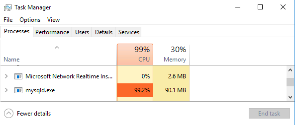 When checking the Task Manager the process "mysqld.exe" is consuming a lot of CPU resources.